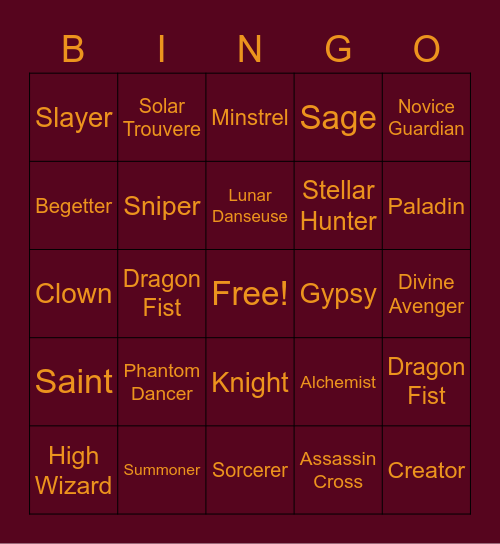 This bingo card has a free space and 64 words: DPS, Arcane Master, Soulblade Cross, Dragon Fist, Spirit Whisperer, Taekwon, Solar Trouvere, Spiritualist, Lunar Danseuse, Runemaster, Knight, Chronomancer, Divine Avenger, Novice Guardian, Wizard, Begetter, Dragon Fist, Slayer, Crusader, Stellar Hunter, Phantom Dancer, Saint, Sage, Lightbringer, Assassin, Rogue, Hunter, Bard, Dancer, Priest, Monk, Blacksmith, Advanced Novice, Lord Knight, Paladin, High Wizard, Professor, Assassin Cross, Stalker, Sniper, Clown, Gypsy, High Priest, Champion, Whitesmith, Creator, Summoner, Super novice, Alchemist, Rune Knight, Royal Guard, Warlock, Sorcerer, Guillotine Cross, Shadow Chaser, Ranger, Minstrel, Wanderer, Archbishop, Shura, Mechanic, Genetic, Animist and ROM.