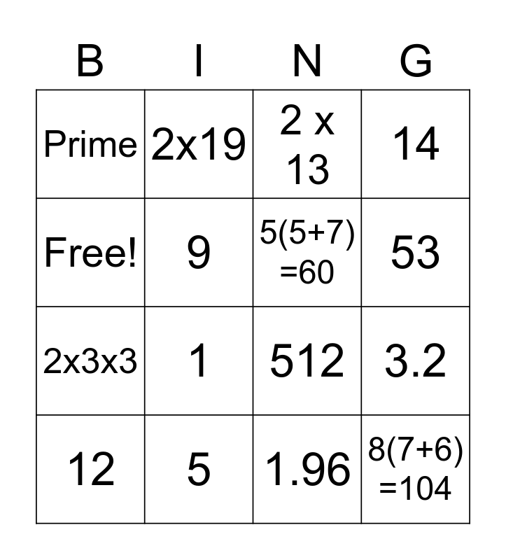 This bingo card has 16 words: 5, 3.2, 2 x 13, Prime, 2x3x3, 2x19, 512, 1.96, Free!, 9, 12, 14, 1, 53, 5(5+7) =60 and 8(7+6) =104.