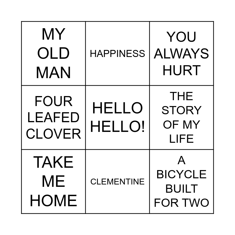 This bingo card has a free space and 11 words: MOVE OVER DARLING, CLEMENTINE, A BICYCLE BUILT FOR TWO, TAKE ME HOME, HAPPINESS, YOU ALWAYS HURT, THE STORY OF MY LIFE, YODEL, FOUR LEAFED CLOVER, MY OLD MAN and MORNINGTOWN RIDE.