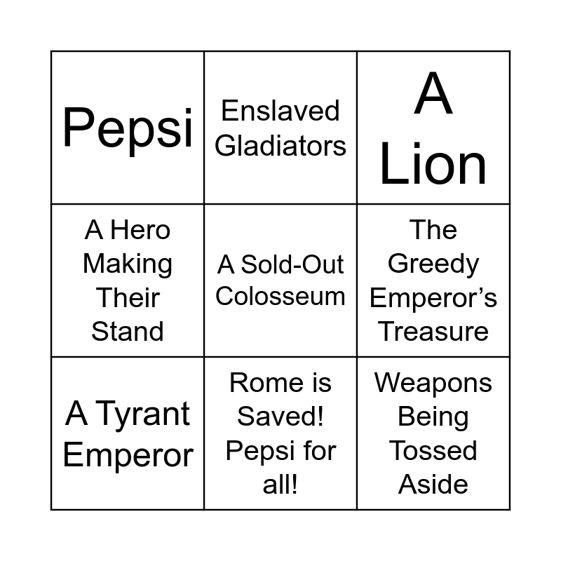 This bingo card has 9 words: A Tyrant Emperor, A Lion, Enslaved Gladiators, A Hero Making Their Stand, Pepsi, The Greedy Emperor’s Treasure, A Sold-Out Colosseum, Weapons Being Tossed Aside and Rome is Saved! Pepsi for all!.