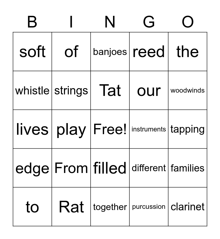 This bingo card has a free space and 24 words: From, Rat, Tat, to, the, soft, whistle, of, instruments, filled, our, lives, different, families, strings, purcussion, tapping, banjoes, woodwinds, play, clarinet, edge, reed and together.