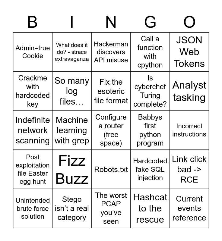 This bingo card has a free space and 24 words: Fizz Buzz, Stego isn’t a real category, Fix the esoteric file format, Unintended brute force solution, JSON Web Tokens, Admin=true Cookie, Crackme with hardcoded key, What does it do? - strace extravaganza, Babbys first python program, Robots.txt, Is cyberchef Turing complete?, Indefinite network scanning, Hardcoded fake SQL injection, Link click bad -> RCE, So many log files…, Hashcat to the rescue, Incorrect instructions, Hackerman discovers API misuse, Analyst tasking, Machine learning with grep, Current events reference, Post exploitation file Easter egg hunt, Call a function with cpython and The worst PCAP you’ve seen.