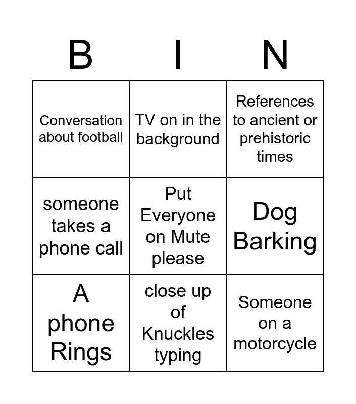 This bingo card has a free space and 8 words: Dog Barking, References to ancient or prehistoric times, TV on in the background, A phone Rings, Conversation about football, Someone on a motorcycle, someone takes a phone call and close up of Knuckles typing.