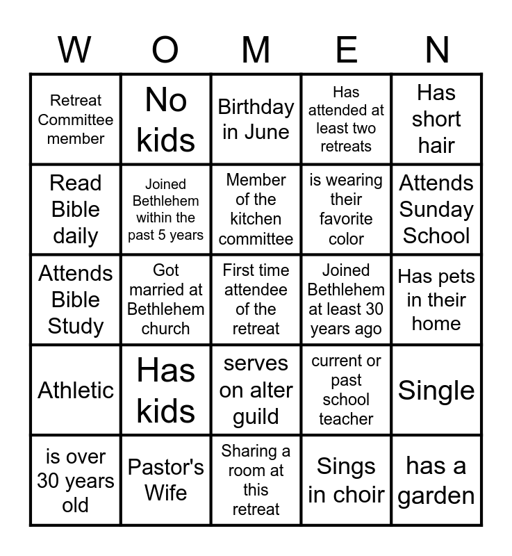 This bingo card has 25 words: Athletic, Pastor's Wife, First time attendee of the retreat, Sings in choir, Has short hair, Retreat Committee member, No kids, Birthday in June, Joined Bethlehem at least 30 years ago, Single, Read Bible daily, Joined Bethlehem within the past 5 years, Sharing a room at this retreat, current or past school teacher, Attends Sunday School, is over 30 years old, Got married at Bethlehem church, Member of the kitchen committee, is wearing their favorite color, Has pets in their home, Attends Bible Study, Has kids, serves on alter guild, Has attended at least two retreats and has a garden.