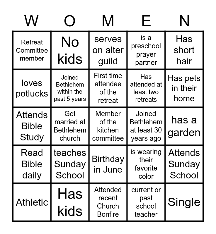 This bingo card has 30 words: Athletic, Pastor's Wife, First time attendee of the retreat, Sings in choir, Has short hair, Retreat Committee member, No kids, Birthday in June, Joined Bethlehem at least 30 years ago, Single, Read Bible daily, Joined Bethlehem within the past 5 years, Sharing a room at this retreat, current or past school teacher, Attends Sunday School, is over 30 years old, Got married at Bethlehem church, Member of the kitchen committee, is wearing their favorite color, Has pets in their home, Attends Bible Study, Has kids, serves on alter guild, Has attended at least two retreats, has a garden, loves potlucks, teaches Sunday School, Attended recent Church Bonfire, is a preschool prayer partner and plan to attend Trunk or Treat.