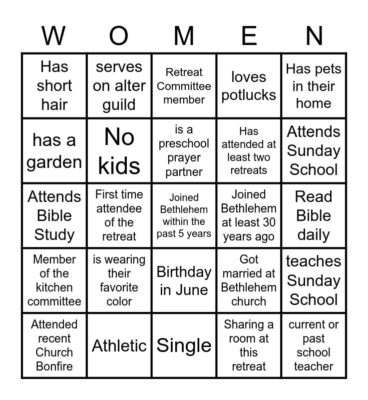This bingo card has 30 words: Athletic, Pastor's Wife, First time attendee of the retreat, Sings in choir, Has short hair, Retreat Committee member, No kids, Birthday in June, Joined Bethlehem at least 30 years ago, Single, Read Bible daily, Joined Bethlehem within the past 5 years, Sharing a room at this retreat, current or past school teacher, Attends Sunday School, is over 30 years old, Got married at Bethlehem church, Member of the kitchen committee, is wearing their favorite color, Has pets in their home, Attends Bible Study, Has kids, serves on alter guild, Has attended at least two retreats, has a garden, loves potlucks, teaches Sunday School, Attended recent Church Bonfire, is a preschool prayer partner and plan to attend Trunk or Treat.