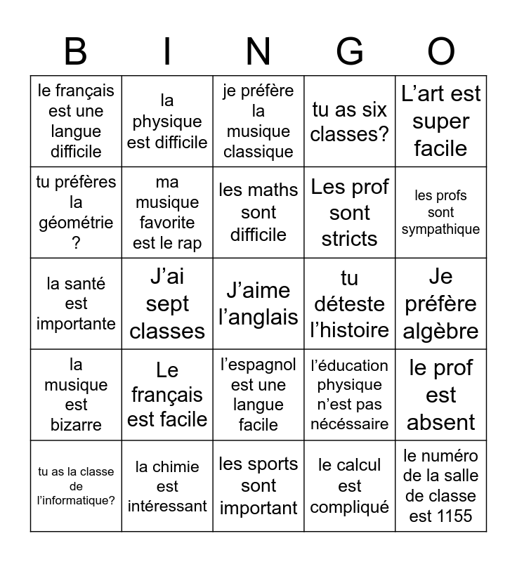 This bingo card has a free space and 24 words: Le français est facile, la chimie est intéressant, les maths sont difficile, tu as la classe de l’informatique?, L’art est super facile, le français est une langue difficile, tu préfères la géométrie ?, la physique est difficile, tu déteste l’histoire, l’espagnol est une langue facile, Les prof sont stricts, la santé est importante, l’éducation physique n’est pas nécéssaire, le prof est absent, ma musique favorite est le rap, le calcul est compliqué, Je préfère algèbre, je préfère la musique classique, les profs sont sympathique, J’ai sept classes, le numéro de la salle de classe est 1155, la musique est bizarre, tu as six classes? and les sports sont important.