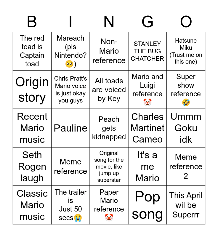 This bingo card has a free space and 24 words: Meme reference, The trailer is Just 50 secsðŸ˜, All toads are voiced by Key, Classic Mario music, Hatsune Miku (Trust me on this one), The red toad is Captain toad, Origin story, Mareach (pls Nintendo?🥺), Charles Martinet Cameo, Original song for the movie, like jump up superstar, Mario and Luigi reference 🤡, Recent Mario music, It's a me Mario, Meme reference 2, Chris Pratt's Mario voice is just okay you guys, Pop song, Ummm Goku idk, Non-Mario reference, Super show reference 🤣, Pauline, This April wil be Superrr, Seth Rogen laugh, STANLEY THE BUG CHATCHER and Paper Mario reference 🤡.
