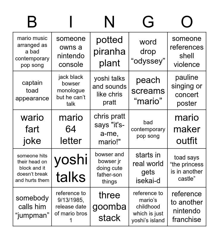 This bingo card has a free space and 38 words: charles martinet voice cameo, seth rogen donkey kong laugh, mushrooms are referenced as drugs, jack black bowser monologue but he can’t talk, toad says “the princess is in another castle”, yoshi talks, yoshi talks and sounds like chris pratt, mario kart reference, someone references shell violence, peach screams “mario”, mario 64 letter, word drop “odyssey”, reference to another nintendo franchise, mario maker outfit, captain toad appearance, someone hits their head on block and it doesn’t break and hurts them, luigi isn’t in the trailer, potted piranha plant, ”beware chain chomp” sign, bad contemporary pop song, mario music arranged as a bad contemporary pop song, reference to 9/13/1985, release date of mario bros 1, pauline singing or concert poster, somebody calls him “jumpman”, paper mario reference, three goomba stack, cappy, reference to finding luigi: legend of parkour, wanted posters for wario, waluigi, koopalings, lakitu is every traffic light, mario super sluggers reference, bowser and bowser jr doing cute father-son things, reference to mario’s childhood which is just yoshi’s island, someone owns a nintendo console, mario does the galaxy spin attack, starts in real world gets isekai-d, wario fart joke and minions in the background.