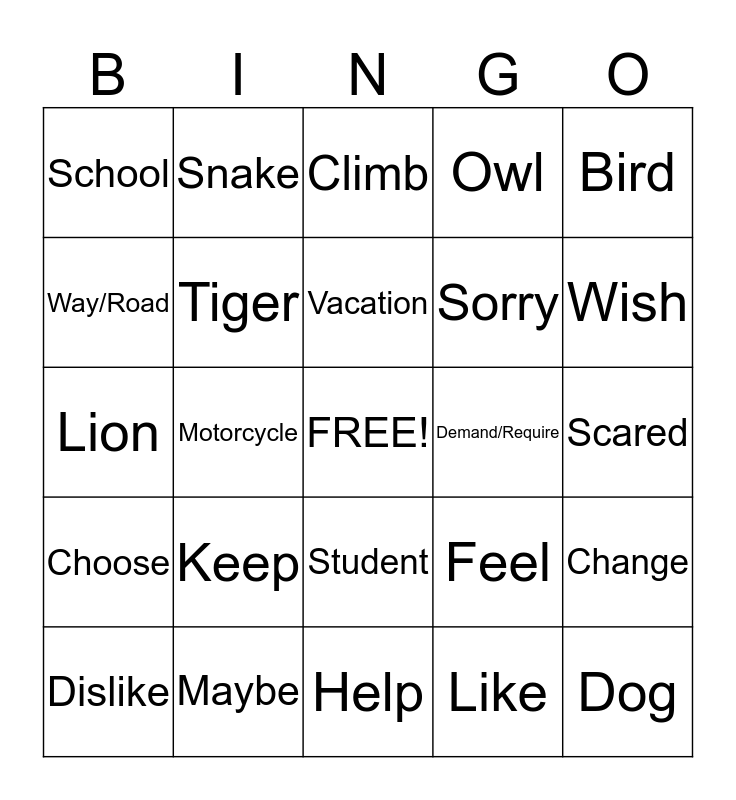 This bingo card has a free space and 77 words: Stand, Fall, Climb, Kneel, Sit, Chair, Car, Flat Tire, Walk, Run, Kick, Awkward, Vacation, Way/Road, Airplane, Motorcycle, Animal, Dog, Cat, Bird, Bear, Lion, Tiger, Snake, Owl, Fish, Monkey, Elephant, Pig, Horse, Bug, Love, Hate, Feel, Wish, Sorry, Cry, Mad, Scared, Like, Please, Happy, Sad, Laugh, Want, Don't want, Dislike, School, Teach, Learn, Teacher, Student, Study, Practice, Library, Read, Write, Word, Art, Song, Keep, Continue, Stay, Welcome, Meeting, Spread, Take, Demand/Require, Meet, Finnished, Have, Change, Choose, Maybe, Try, Help and Win.