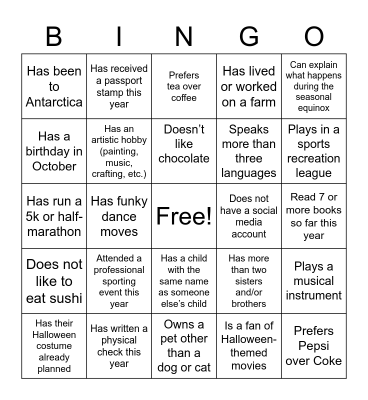 This bingo card has a free space and 24 words: Attended a professional sporting event this year, Has written a physical check this year, Doesn’t like chocolate, Has their Halloween costume already planned, Can explain what happens during the seasonal equinox, Has been to Antarctica, Has a birthday in October, Has received a passport stamp this year, Does not have a social media account, Has a child with the same name as someone else’s child, Speaks more than three languages, Has run a 5k or half-marathon, Has more than two sisters and/or brothers, Plays a musical instrument, Has an artistic hobby (painting, music, crafting, etc.), Is a fan of Halloween-themed movies, Read 7 or more books so far this year, Prefers tea over coffee, Plays in a sports recreation league, Has funky dance moves, Prefers Pepsi over Coke, Does not like to eat sushi, Has lived or worked on a farm and Owns a pet other than a dog or cat.