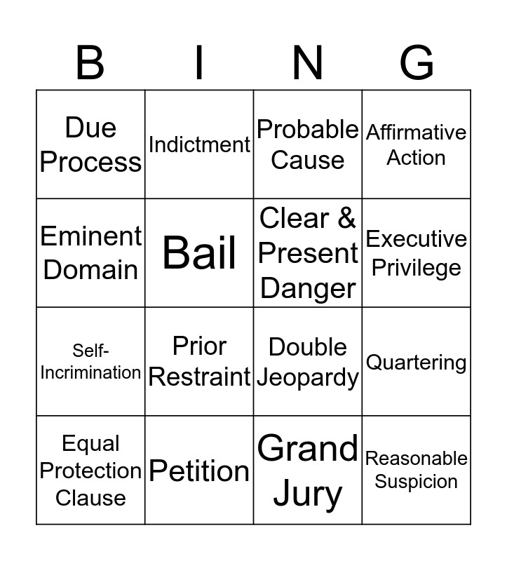 This bingo card has 16 words: Petition, Quartering, Probable Cause, Due Process, Self-Incrimination, Indictment, Double Jeopardy, Grand Jury, Eminent Domain, Bail, Equal Protection Clause, Affirmative Action, Prior Restraint, Executive Privilege, Clear & Present Danger and Reasonable Suspicion.