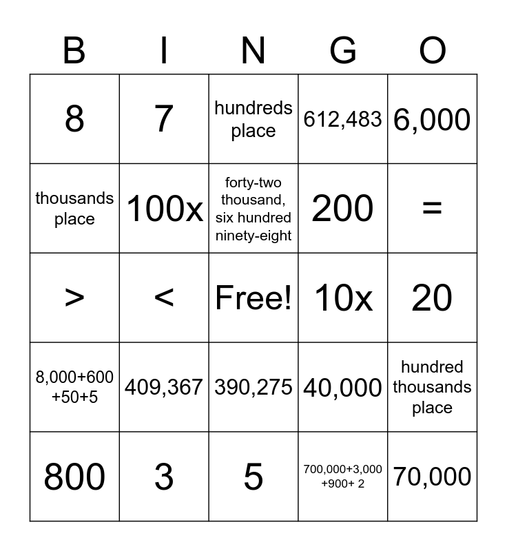 This bingo card has a free space and 24 words: 409,367, 3, forty-two thousand, six hundred ninety-eight, 800, 6,000, 8, thousands place, 7, 10x, 390,275, 200, >, 40,000, hundred thousands place, 100x, 700,000+3,000 +900+ 2, 20, hundreds place, =, <, 70,000, 8,000+600 +50+5, 612,483 and 5.