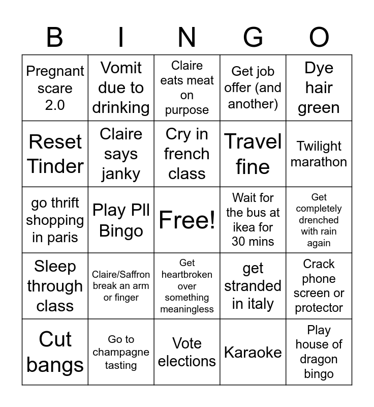 This bingo card has a free space and 24 words: Claire/Saffron break an arm or finger, Go to champagne tasting, Cry in french class, Cut bangs, Dye hair green, Pregnant scare 2.0, Reset Tinder, Vomit due to drinking, Wait for the bus at ikea for 30 mins, Get heartbroken over something meaningless, Travel fine, go thrift shopping in paris, get stranded in italy, Crack phone screen or protector, Claire says janky, Karaoke, Get completely drenched with rain again, Claire eats meat on purpose, Twilight marathon, Play Pll Bingo, Play house of dragon bingo, Sleep through class, Get job offer (and another) and Vote elections.