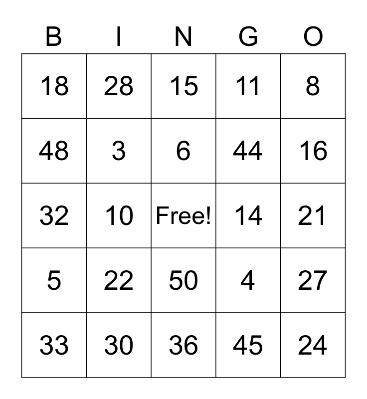 This bingo card has a free space and 36 words: 0, 1, 2, 3, 4, 5, 6, 7, 8, 9, 10, 11, 12, 14, 16, 18, 20, 22, 24, 15, 21, 27, 30, 33, 36, 28, 32, 40, 44, 48, 25, 35, 45, 50, 55 and 60.