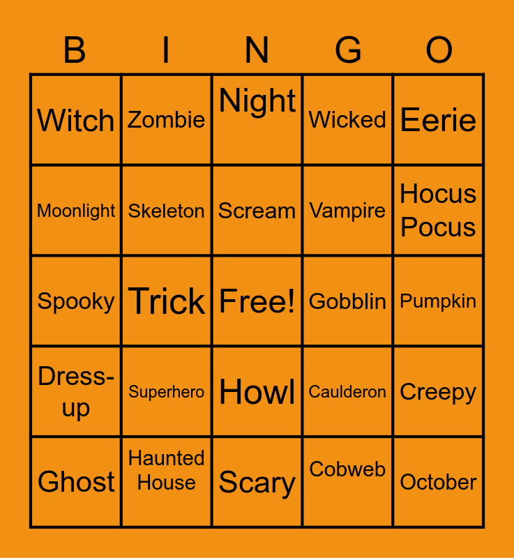 This bingo card has a free space and 29 words: Ghost, Candy, Trick, Treat, Witch, Night, Skeleton, Superhero, Gobblin, Haunted House, Pumpkin, October, Scary, Cobweb, Hocus Pocus, Haunt, Howl, Dress-up, Eerie, Spooky, Caulderon, Darkness, Vampire, Moonlight, Wicked, Zombie, Creepy, Scream and Costume.
