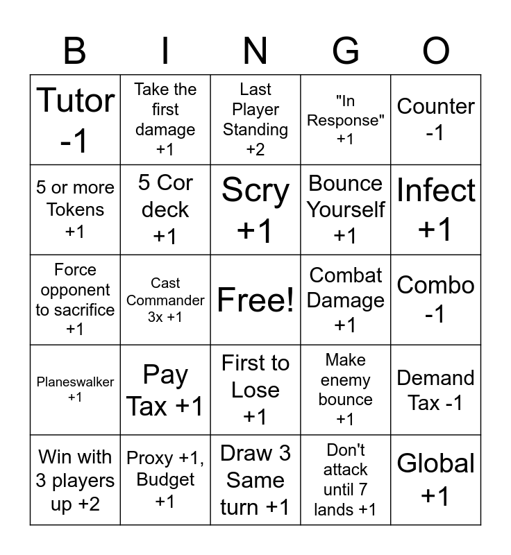 This bingo card has a free space and 37 words: Mana + Sol Ring -1, Mana + Sol Ring + Mana Rock -2, Mono-Cor Deck +1, 5 Cor deck +1, Demand Tax -1, Pay Tax +1, Scry +1, Exile Grave +1, Counter -1, Counter the Counter +2, Cast Commander 3x +1, "In Response" +1, Global +1, Combo -1, 5 or more Tokens +1, Planeswalker +1, Non-mana Activated Ability +1, Last Player Standing +2, First to Lose +1, Combat Damage +1, Tutor -1, Infect +1, Win with 3 players up +2, Draw 3 Same turn +1, Discard On End Step, Don't attack until 7 lands +1, Take the first damage +1, Be the first to play +1, Be the last to play +1, 10 permanents before turn 6 -1, Attack all 3 opponents Same Turn +1, Proxy +1, Budget +1, Force opponent to sacrifice +1, Block with a 1/1 +1, Make enemy bounce +1, Bounce Yourself +1 and Tribal +1.
