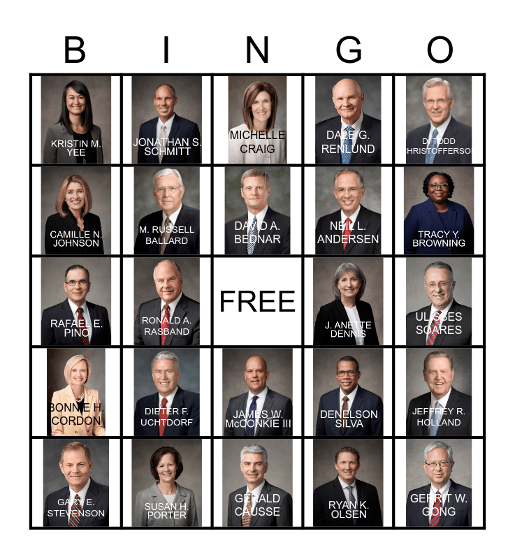 This bingo card has 38 images, a free space and 20 words: RUSSELL M. NELSON, DALLIN H. OAKS, HENRY B. EYRING, M. RUSSELL BALLARD, JEFFREY R. HOLLAND, DIETER F. UCHTDORF, DAVID A. BEDNAR, QUENTIN L. COOK, D. TODD CHRISTOFFERSON, NEIL L. ANDERSEN, RONALD A. RASBAND, DALE G. RENLUND, GERRIT W. GONG, ULISSES SOARES, BONNIE H. CORDON, MICHELLE CRAIG, BECKY CRAVEN, GARY E. STEVENSON, GERALD CAUSSE and STEVEN J. LUND.