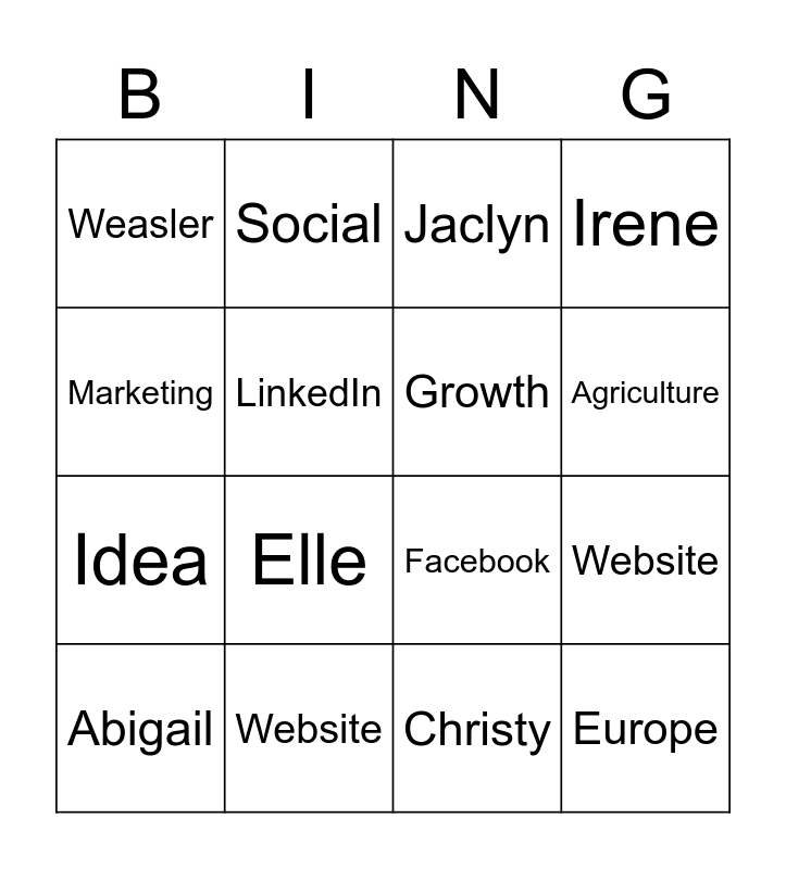 This bingo card has 24 words: Spiderweb, Market, Agriculture, Construction, Marketing, Weasler, LinkedIn, Social, Website, Brainstorm, Idea, Facebook, CentroMotion, Example, Growth, Andy, Christy, Jaclyn, Elle, Website, Abigail, Europe, Irene and Connect.