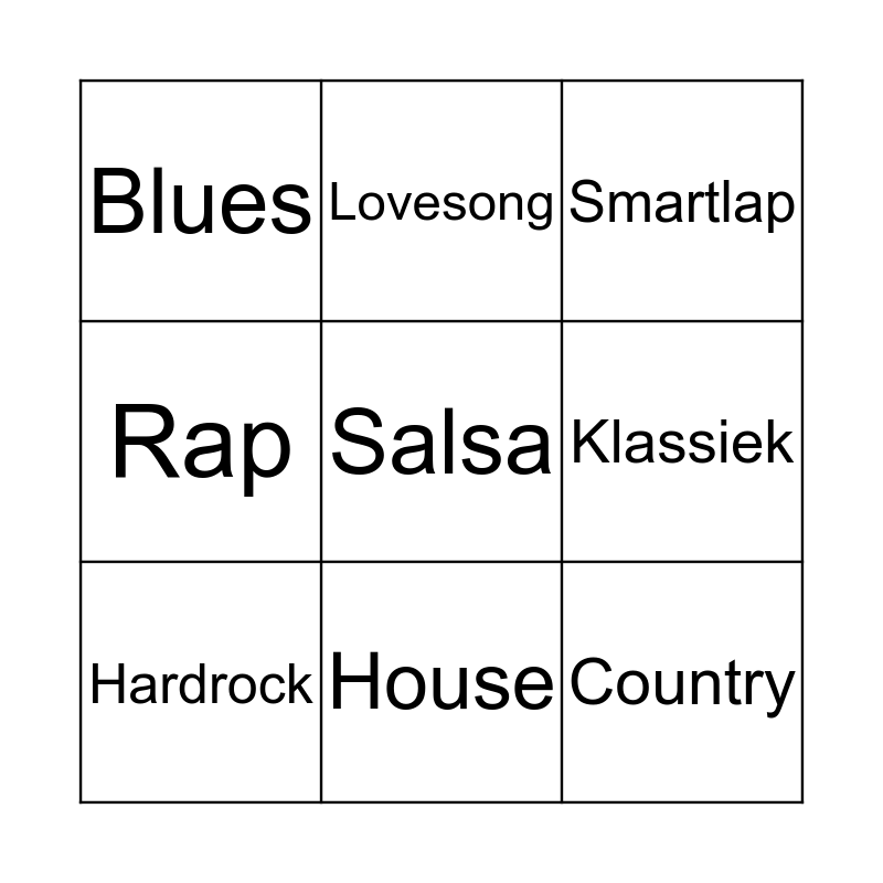 This bingo card has 12 words: Reggae, Country, Salsa, Klassiek, Lovesong, Smartlap, House, Kindermuziek, Blues, Rap, Hardrock and Nederlandstalig.