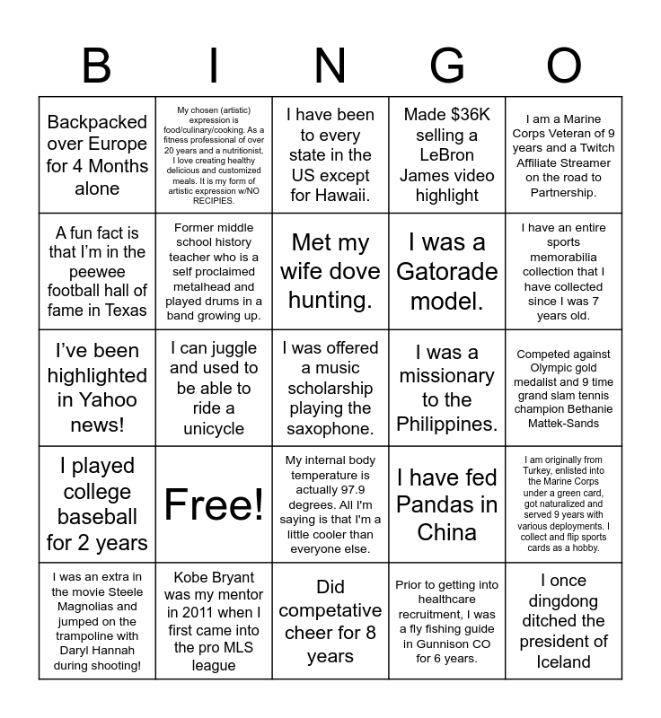 This bingo card has 25 words: Free!, Did competative cheer for 8 years, Met my wife dove hunting., I was an extra in the movie Steele Magnolias and jumped on the trampoline with Daryl Hannah during shooting!, I am a Marine Corps Veteran of 9 years and a Twitch Affiliate Streamer on the road to Partnership., Backpacked over Europe for 4 Months alone, A fun fact is that I’m in the peewee football hall of fame in Texas, My chosen (artistic) expression is food/culinary/cooking. As a fitness professional of over 20 years and a nutritionist, I love creating healthy delicious and customized meals. It is my form of artistic expression w/NO RECIPIES., I was a missionary to the Philippines., My internal body temperature is actually 97.9 degrees. All I'm saying is that I'm a little cooler than everyone else., I was a Gatorade model., I’ve been highlighted in Yahoo news!, I have fed Pandas in China, I am originally from Turkey, enlisted into the Marine Corps under a green card, got naturalized and served 9 years with various deployments. I collect and flip sports cards as a hobby., Former middle school history teacher who is a self proclaimed metalhead and played drums in a band growing up., I once dingdong ditched the president of Iceland, Competed against Olympic gold medalist and 9 time grand slam tennis champion Bethanie Mattek-Sands, I have been to every state in the US except for Hawaii., I have an entire sports memorabilia collection that I have collected since I was 7 years old., I can juggle and used to be able to ride a unicycle, I was offered a music scholarship playing the saxophone., Kobe Bryant was my mentor in 2011 when I first came into the pro MLS league, I played college baseball for 2 years, Made $36K selling a LeBron James video highlight and Prior to getting into healthcare recruitment, I was a fly fishing guide in Gunnison CO for 6 years..