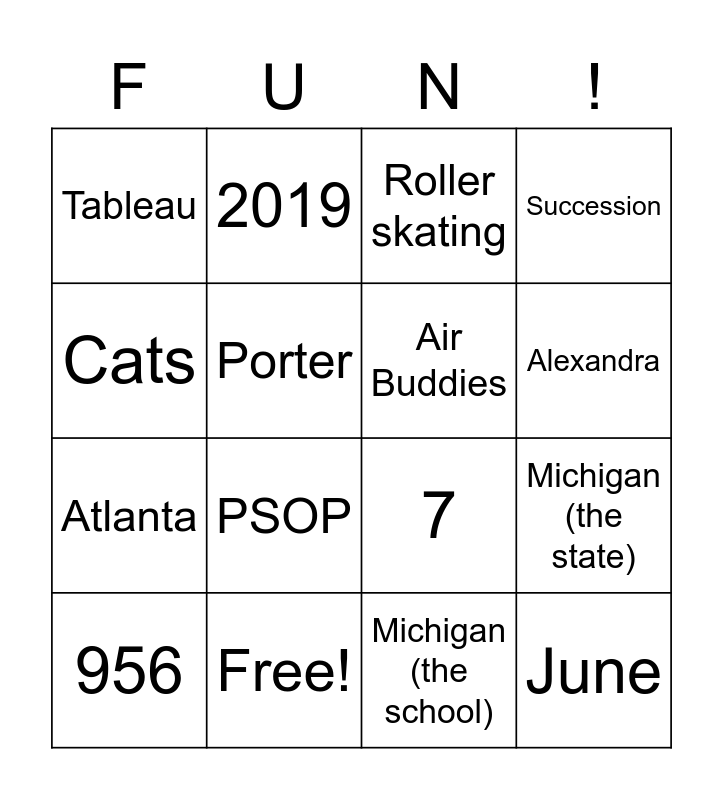 This bingo card has 16 words: Free!, Michigan (the state), Roller skating, Tableau, Atlanta, 2019, 7, Michigan (the school), Cats, Porter, 956, Succession, PSOP, Alexandra, Air Buddies and June.