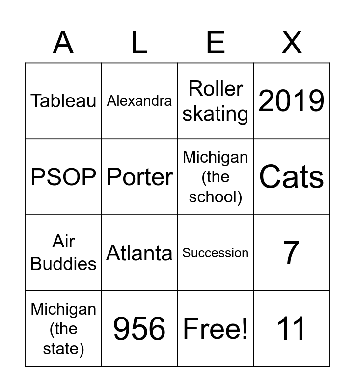 This bingo card has 17 words: Free!, Michigan (the state), Roller skating, Tableau, Atlanta, 2019, 7, Michigan (the school), Cats, Porter, 956, Succession, PSOP, Alexandra, Air Buddies, June and 11.