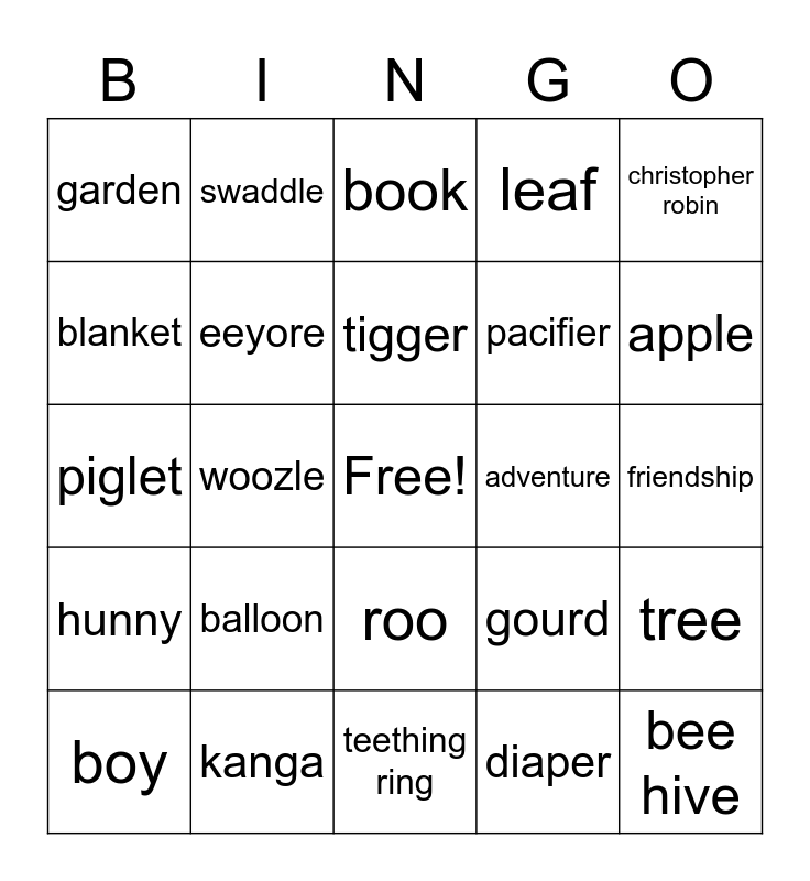 This bingo card has a free space and 40 words: pooh, piglet, rabbit, eeyore, kanga, roo, tigger, owl, christopher robin, hunny, woozle, leaf, bee hive, friendship, adventure, balloon, dream, garden, explore, book, tree, diaper, pacifier, blanket, flower, bottle, onesie, baby oil, socks, brush, crib, boy, pumpkin, gourd, apple, teething ring, wipes, bath toys, swaddle and milk.