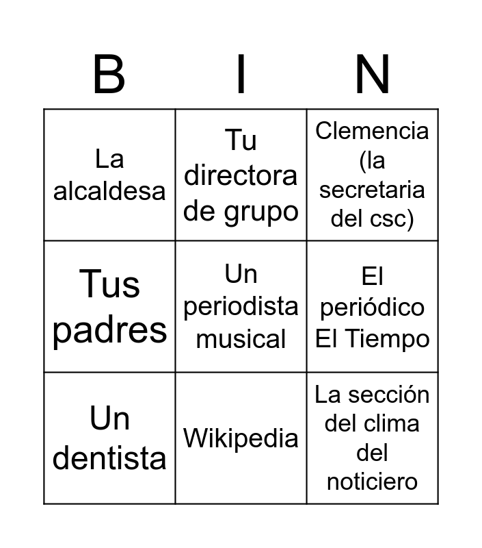 This bingo card has 13 words: Free!, Cristiano Ronaldo, Un dentista, Tu directora de grupo, Tus padres, Un periodista musical, La sección del clima del noticiero, El presidente de Colombia, Wikipedia, La alcaldesa, El periódico El Tiempo, Clemencia (la secretaria del csc) and Un médico..