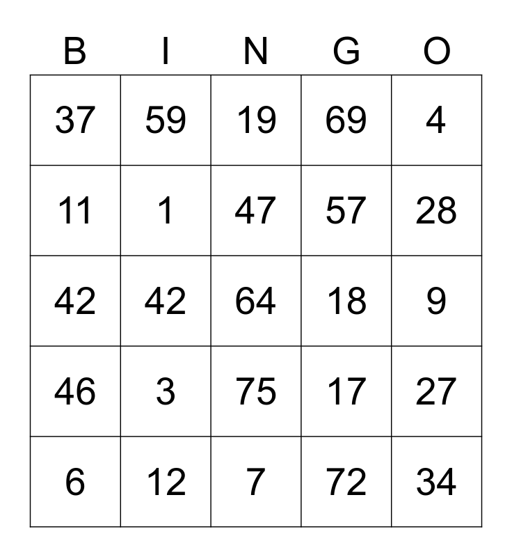 This bingo card has a free space and 24 words: 3, 12, 47, 6, 4, 37, 11, 59, 18, 75, 57, 42, 17, 27, 1, 72, 9, 19, 28, 42, 34, 46, 69 and 7.