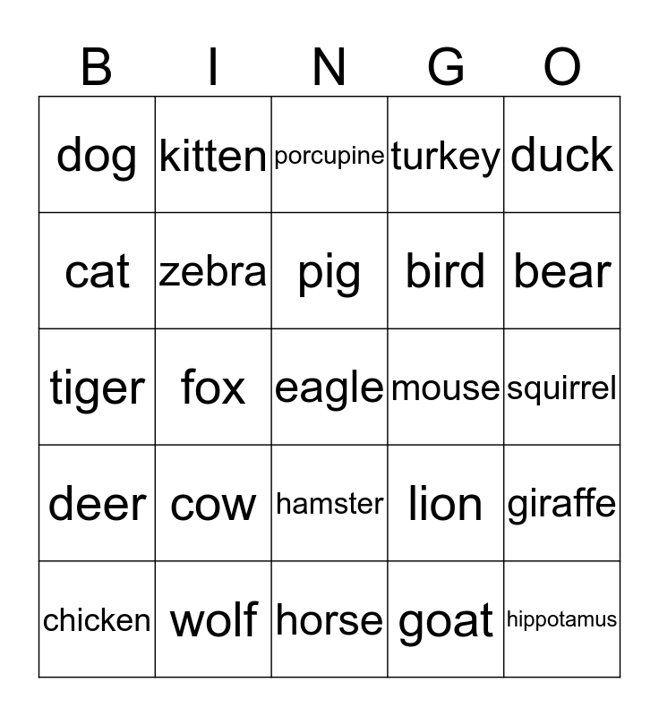 This bingo card has 25 words: cow, horse, pig, chicken, duck, dog, cat, kitten, mouse, hamster, bird, tiger, lion, giraffe, zebra, hippotamus, squirrel, porcupine, bear, fox, eagle, wolf, deer, turkey and goat.