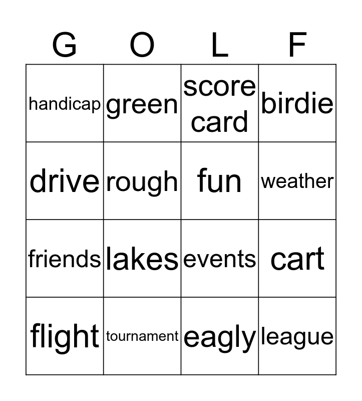 This bingo card has a free space and 15 words: flight, league, score card, handicap, weather, drive, lakes, eagly, rough, friends, cart, birdie, fun, green and tournament.