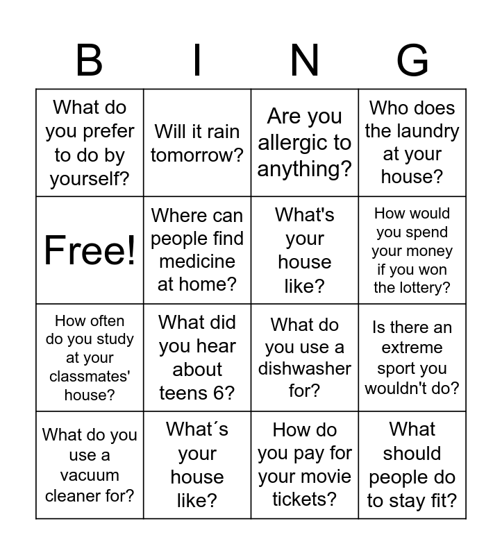 This bingo card has 16 words: What´s your house like?, Is there an extreme sport you wouldn't do?, Are you allergic to anything?, What do you prefer to do by yourself?, How often do you study at your classmates' house?, Will it rain tomorrow?, What do you use a dishwasher for?, How do you pay for your movie tickets?, Free!, Where can people find medicine at home?, What do you use a vacuum cleaner for?, Who does the laundry at your house?, What did you hear about teens 6?, How would you spend your money if you won the lottery?, What's your house like? and What should people do to stay fit?.