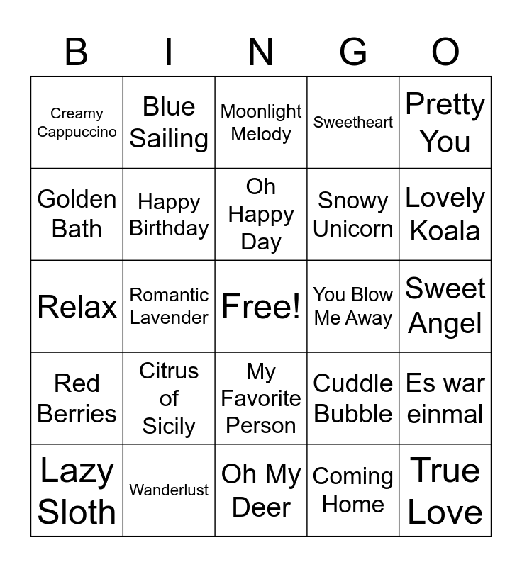 This bingo card has a free space and 39 words: Fluffy Cotton, Frozen Rose, Gingerbread Cookies, Happy Birthday, Lazy Sloth, My Favorite Person, Oh Happy Day, Panda Bear, Pretty You, Red Berries, Romantic Lavender, Sweetheart, True Love, Sweet Angel, You Blow Me Away, Citrus of Sicily, Cookies & Cream, Creamy Cappuccino, Creamy Vanilla, Cuddle Bubble, Golden Bath, Oh My Deer, Snowy Unicorn, Lovely Koala, Dolphin Daisy, The Sweet Iggy, Puppy Love, East Chick, Blossom the Giraffe, Blue Sailing, Falling in Love, Indian Summer, Moonlight Melody, Wanderlust, Coming Home, Make a Wish, Es war einmal, Relax and Thank You.