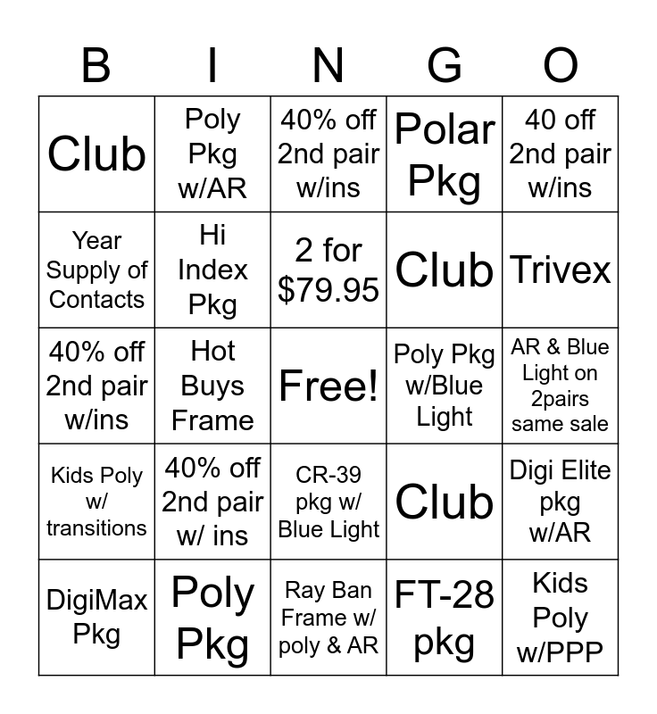 This bingo card has a free space and 24 words: 40% off 2nd pair w/ ins, Poly Pkg, 2 for $79.95, DigiMax Pkg, 40 off 2nd pair w/ins, Club, Year Supply of Contacts, Poly Pkg w/AR, Poly Pkg w/Blue Light, CR-39 pkg w/ Blue Light, Club, 40% off 2nd pair w/ins, Club, Digi Elite pkg w/AR, Hi Index Pkg, FT-28 pkg, AR & Blue Light on 2pairs same sale, 40% off 2nd pair w/ins, Trivex, Hot Buys Frame, Kids Poly w/PPP, Kids Poly w/ transitions, Polar Pkg and Ray Ban Frame w/ poly & AR.