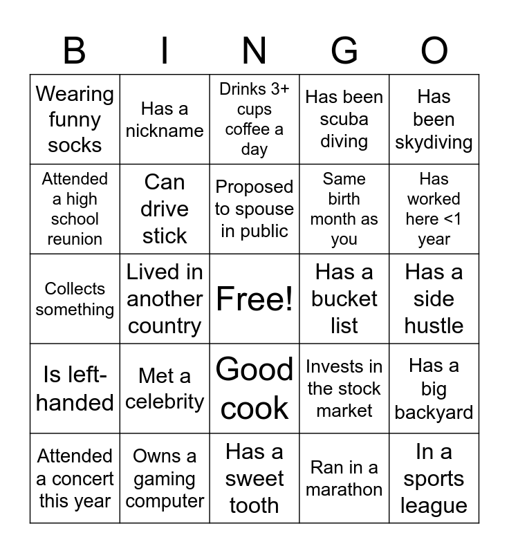 This bingo card has a free space and 24 words: Met a celebrity, Owns a gaming computer, Proposed to spouse in public, Attended a concert this year, Has been skydiving, Wearing funny socks, Attended a high school reunion, Has a nickname, Has a bucket list, Good cook, Same birth month as you, Collects something, Invests in the stock market, Has a big backyard, Can drive stick, Ran in a marathon, Has a side hustle, Drinks 3+ cups coffee a day, Has worked here <1 year, Lived in another country, In a sports league, Is left-handed, Has been scuba diving and Has a sweet tooth.