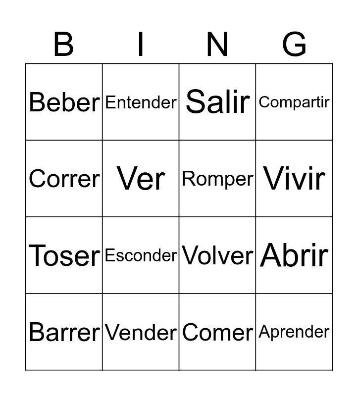 This bingo card has a free space and 15 words: Barrer, Aprender, Salir, Beber, Vivir, Correr, Esconder, Comer, Ver, Toser, Abrir, Compartir, Romper, Entender and Vender.