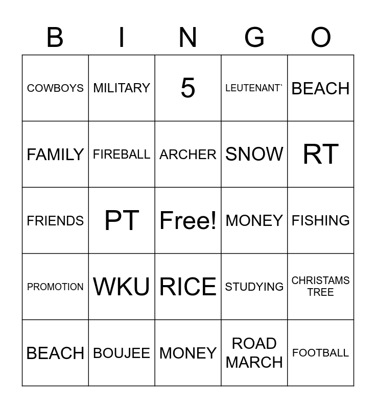 This bingo card has a free space and 74 words: BEER, BOURBOUN, 5, 3, 10, NAILS, OHIO STATE, ALABAMA, BEACH, FLORIDA, ALASKA, HAWAII, ARCHER, FAMILY, FRIENDS, PT, HOSPITAL, RT, FAMILY, FRIENDS, FIREBALL, MILITARY, LEUTENANT`, BEER PONG, FOOTBALL, WRESTLING, HEALLTHY, CHICKEN, RECTEC, FIRE PIT, BEACH, SAILING, FISHING, SALMOND, SUSHI, ROAD MARCH, WORK OUT, RUNNING, HUNTING, FISHING, MONEY, BOUJEE, CHRISTMAS, HALLWEEN, TRAVEL, COWBOYS, FATERNITY, WKU, BELLARMINE, SULLIVAN, MIDWESTERN STATE UNIVERSITY TEXAS, HUNTING, FISHING, FIRE PIT, ROAST, GRILLING, RICE, HEXCLAD, DOG, CHRISTAMS TREE, SNOW, FEBRURAY, PROMOTION, WORKING, MONEY, SHOOTING, SCRUBS, DRINKING, STUDYING, ARMY, ENLISTED, OFFICER, HIKING and CHRISTMAS TREE.