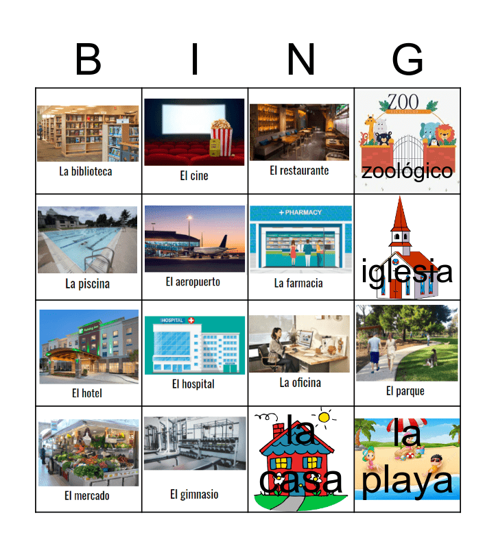 This bingo card has 20 images and 5 words: la playa, iglesia, zoológico, la casa and centro comercial.
