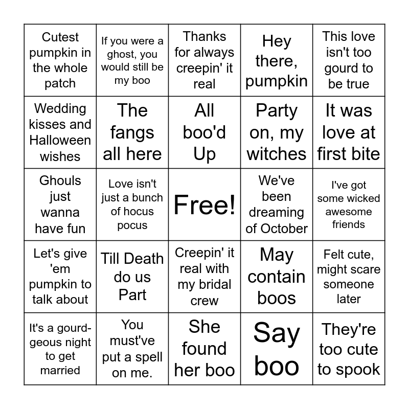 This bingo card has a free space and 25 words: Till Death do us Part, She found her boo, All boo'd Up, It's a gourd-geous night to get married, This love isn't too gourd to be true, Cutest pumpkin in the whole patch, Wedding kisses and Halloween wishes, If you were a ghost, you would still be my boo, We've been dreaming of October, Creepin' it real with my bridal crew, Party on, my witches, Ghouls just wanna have fun, May contain boos, Felt cute, might scare someone later, The fangs all here, Tonight's wedding rules: eat, drink, and be scary, I've got some wicked awesome friends, Thanks for always creepin' it real, It was love at first bite, Love isn't just a bunch of hocus pocus, They're too cute to spook, You must've put a spell on me., Let's give 'em pumpkin to talk about, Hey there, pumpkin and Say boo.