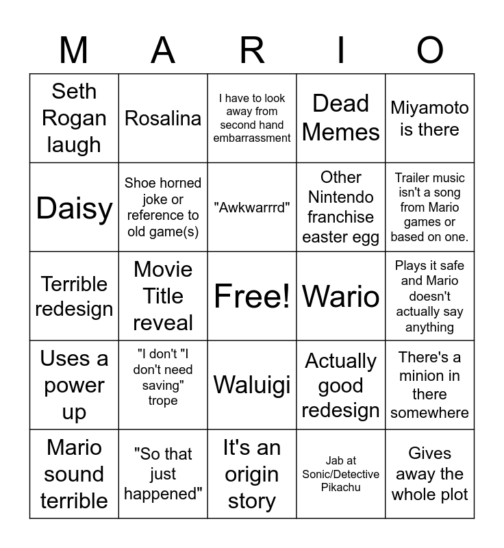 This bingo card has a free space and 24 words: "I don't "I don't need saving" trope, "So that just happened", "Awkwarrrd", Mario sound terrible, Miyamoto is there, Seth Rogan laugh, Daisy, Rosalina, Wario, Waluigi, Other Nintendo franchise easter egg, Terrible redesign, Actually good redesign, There's a minion in there somewhere, Shoe horned joke or reference to old game(s), Jab at Sonic/Detective Pikachu, Plays it safe and Mario doesn't actually say anything, I have to look away from second hand embarrassment, Trailer music isn't a song from Mario games or based on one., Movie Title reveal, Gives away the whole plot, Uses a power up, Dead Memes and It's an origin story.