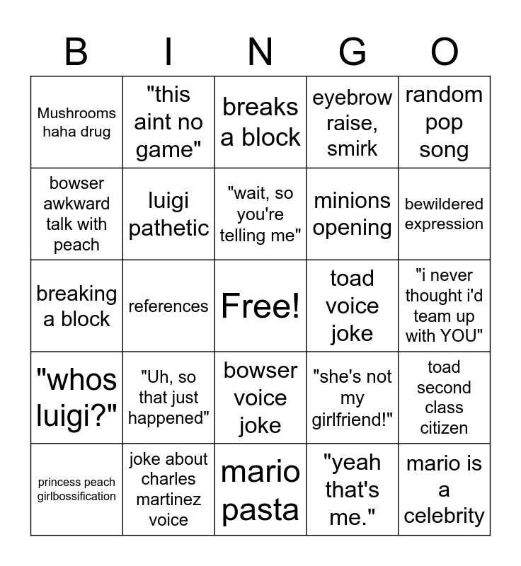 This bingo card has a free space and 24 words: "Uh, so that just happened", joke about charles martinez voice, "wait, so you're telling me", princess peach girlbossification, random pop song, Mushrooms haha drug, bowser awkward talk with peach, "this aint no game", toad voice joke, bowser voice joke, minions opening, breaking a block, "she's not my girlfriend!", toad second class citizen, luigi pathetic, "yeah that's me.", "i never thought i'd team up with YOU", breaks a block, bewildered expression, references, mario is a celebrity, "whos luigi?", eyebrow raise, smirk and mario pasta.