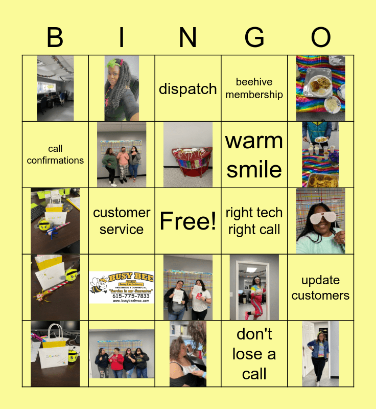This bingo card has 16 images, a free space and 8 words: call confirmations, right tech right call, warm smile, update customers, don't lose a call, dispatch, customer service and beehive membership.