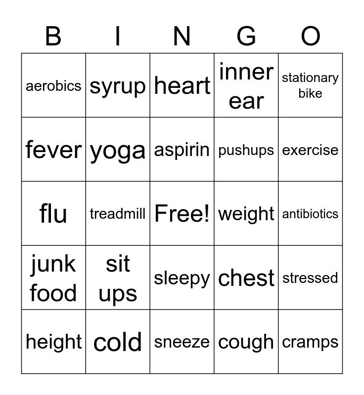 This bingo card has a free space and 24 words: sit ups, cold, aspirin, height, stationary bike, aerobics, fever, syrup, weight, sleepy, pushups, flu, chest, stressed, yoga, cough, antibiotics, heart, exercise, treadmill, cramps, junk food, inner ear and sneeze.