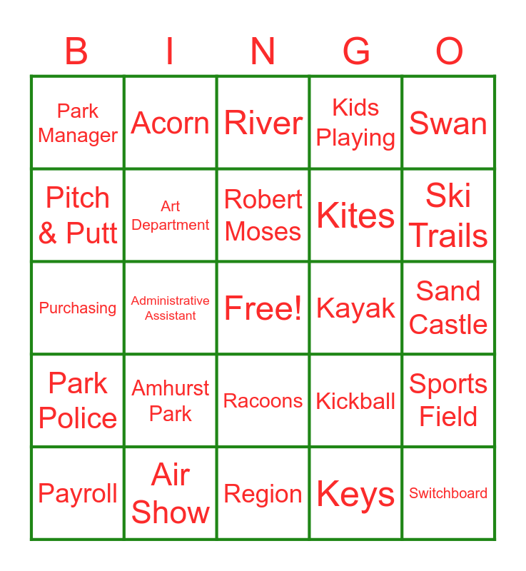 This bingo card has a free space and 74 words: Planting Fields, Adventure, Robert Moses, Kulleseid, Seagull, Park Maintenance, Adirondacks, Recreation, Kabota, Shark, Payroll, Arboretum, Kites, Swan, Permits, Air Show, Row Boats, Kayak, Summer Run Series, Park Manager, Administrative Assistant, River, Kids Playing, Sand Castle, Pitch & Putt, Architect, Rocks, Kelp, Surfing, Pavillion, Art Department, Reservation, Kings Park, Sunken Meadow, Picnic, Automotive Parts, Round About, Ketchup, Switchboard, Paddle Boat, Angling, Racoons, Kebob, Star Gazing, Park Ranger, Acorn, Races, Khakis, Sun Block, Piping Plover, Allen H. Treeman Park, Revenue, Kickball, Snow Mobile, Play Ground, Allegany Park, Region, Killdeer, Swimming Pool, Park Police, Amhurst Park, Retirement, Keys, Sports Field, Purchasing, Ants, Recycle, K-9, Ski Trails, Poinsettas, Axe, Red Robin, Kitchen and Seashell.