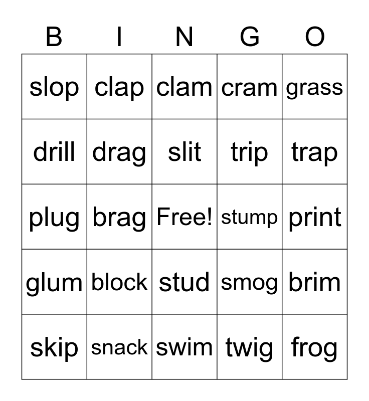 This bingo card has a free space and 29 words: skip, sled, brag, grit, slop, clam, drag, block, stump, snack, print, frog, swim, twig, trap, crud, stud, glum, grass, plug, smog, swell, trip, drill, cram, clap, brim, slit and snip.