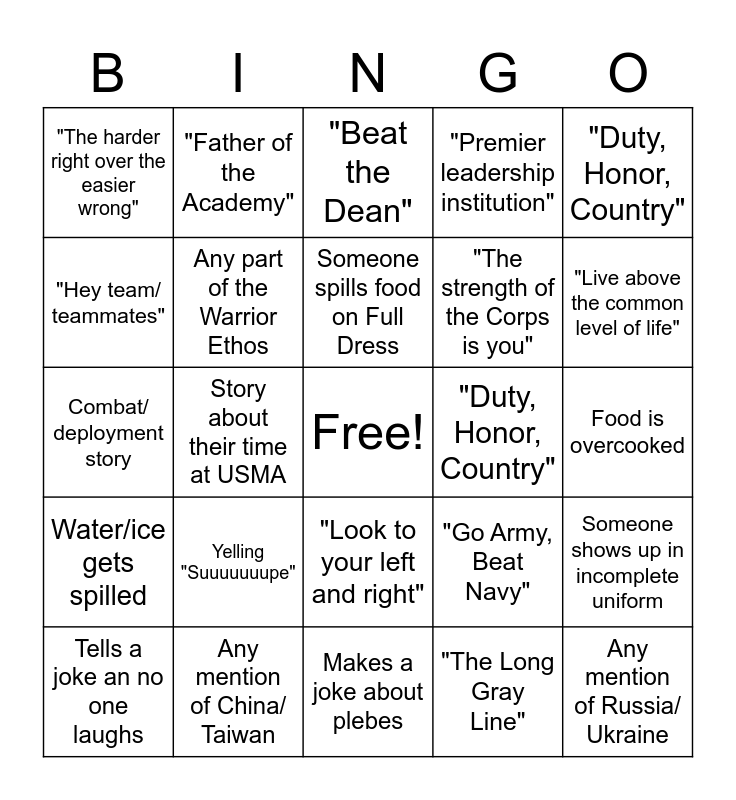 This bingo card has a free space and 24 words: Yelling "Suuuuuuupe", Any mention of China/ Taiwan, Someone spills food on Full Dress, Tells a joke an no one laughs, "Duty, Honor, Country", "The harder right over the easier wrong", "Hey team/ teammates", "Father of the Academy", "Duty, Honor, Country", "Look to your left and right", "The strength of the Corps is you", Combat/ deployment story, "Go Army, Beat Navy", Someone shows up in incomplete uniform, Any part of the Warrior Ethos, "The Long Gray Line", Food is overcooked, "Beat the Dean", "Live above the common level of life", Story about their time at USMA, Any mention of Russia/ Ukraine, Water/ice gets spilled, "Premier leadership institution" and Makes a joke about plebes.