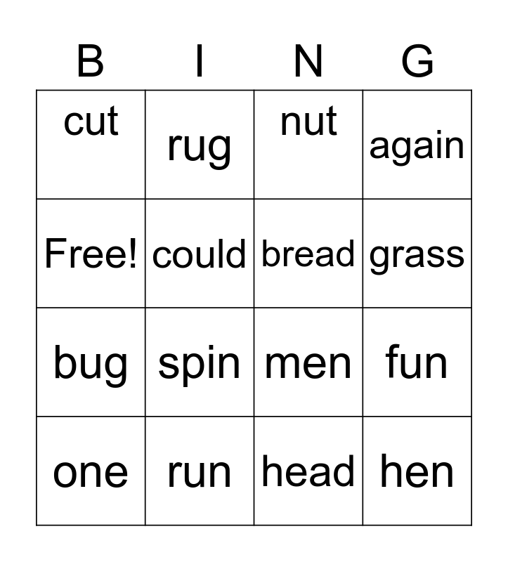 This bingo card has 16 words: run, fun, nut, cut, bug, rug, men, head, Free!, could, one, again, spin, grass, bread and hen.
