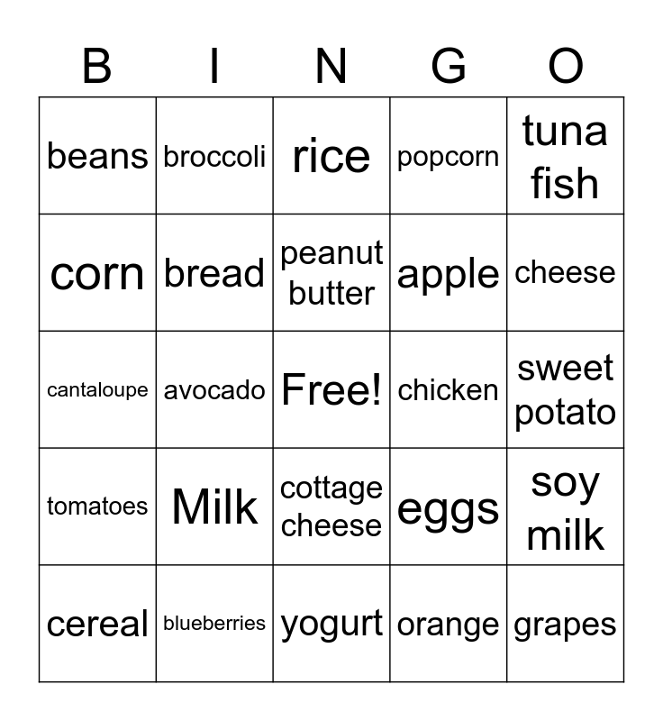 This bingo card has a free space and 24 words: Milk, blueberries, peanut butter, cereal, tuna fish, beans, corn, broccoli, chicken, cottage cheese, apple, cantaloupe, eggs, soy milk, bread, orange, sweet potato, rice, cheese, avocado, grapes, tomatoes, popcorn and yogurt.