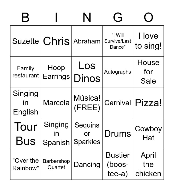 This bingo card has a free space and 24 words: Singing in Spanish, Barbershop Quartet, Los Dinos, "Over the Rainbow", I love to sing!, Suzette, Family restaurant, Chris, Carnival, Sequins or Sparkles, Autographs, Singing in English, Drums, Cowboy Hat, Hoop Earrings, Bustier (boos-tee-a), Pizza!, Abraham, House for Sale, Marcela, April the chicken, Tour Bus, "I Will Survive/Last Dance" and Dancing.